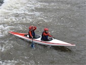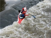 Za středního průtoku jedeme jen kousek z Březiny do Bitýšky, spíš se flákáme a jen na pár vhodných místech trénujeme. Nakonec na jezu v Bitýšce zkoušíme pár nájezdů, ale válec místy nedrží a místy vůbec není, takže jedeme raději domů.
