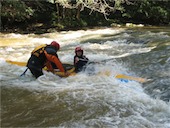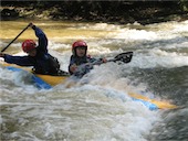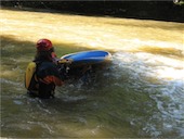 Je dost málo vody a tak si nájezdy do proudu zpestřujeme převracením Matěje a Emy do válce a dalšími skopičinami. Nejlepší je nácvik náklonů na konci - chtěl jsem je převrátit, ale nešlo to, zjistili jsme, že Ema umí udržet loď přes ruku sama o dno. Docela dobrý na 6 let. Nakonec jsem je převrátil a Ema byla pod vodou, nadzdvihnul jsem loď a ona stále nelezla ven, ale křičela "Kde mám pádlo, kde mám pádlo???".