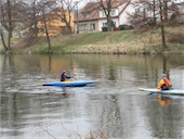 Jedeme proti dost silnému proudu od jezu k mostu v Bitýšce. Tam chvilku trénujeme, Matěj nalézá košík pro maminku. Ema mě nechce v lodi, přestupuje dozadu a sama jede zpátky k jezu.